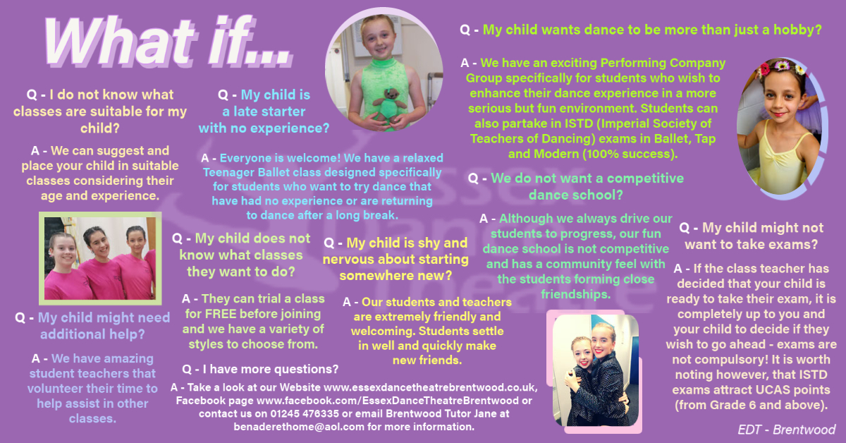 New Students are invited to come for a trial class in any dance styles. Children aged 3-18 with or without previous dance experience are very welcome. If you are unsure which level is suitable for you please do not hesitate to email paulene.sorrell@essex.gov.uk or telephone the EDT Office 0333 013 3249 when we will gladly advise you.